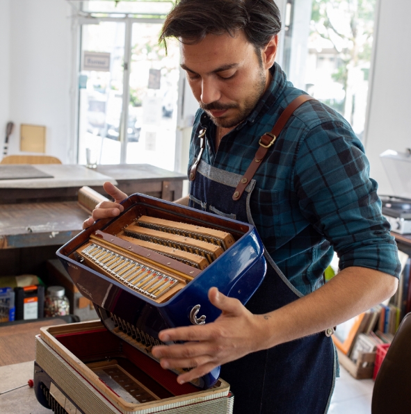 Maxime Barbaud prend soins de votre instrument et vous aide à trouver l’accordéon qui vous ressemble.
